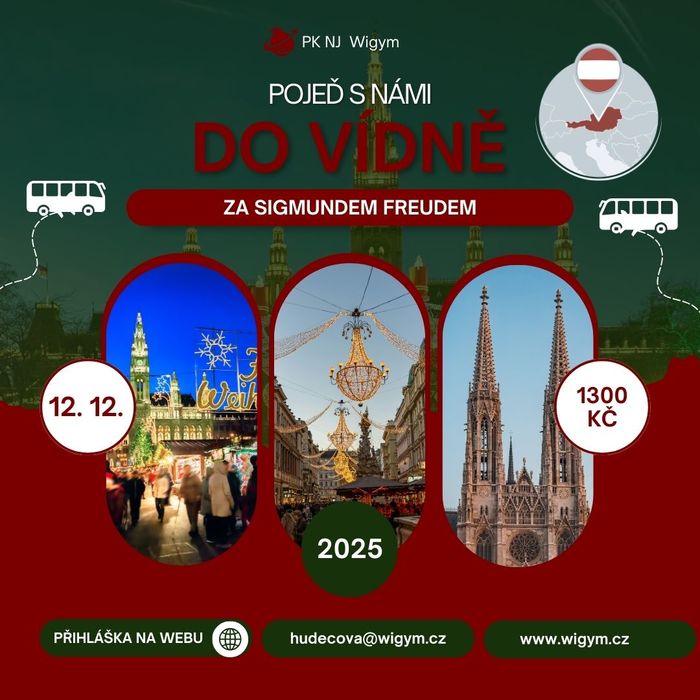 Přihlašování na exkurzi do Vídně, která se uskuteční v pátek 12. 12. bude spuštěno během velké přestávky v úterý 25. 11. 2025 a bude přístupné do neděle 30. 11. Formulář pro přihlášení, který bude aktivní v uvedeném časovém rozpětí, najdete ZDE