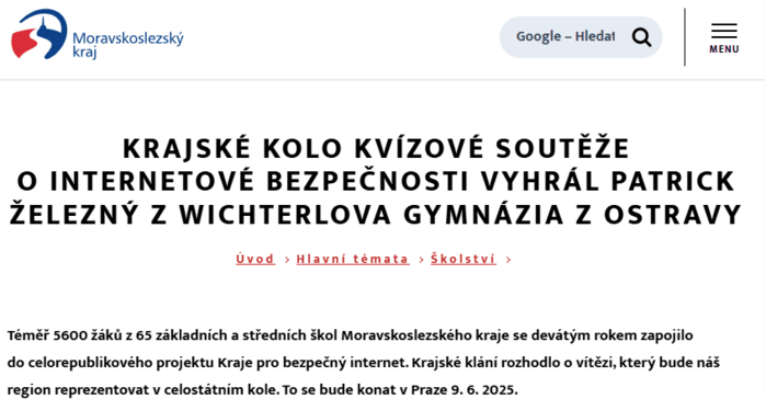 Účastníci projektu Kraje pro bezpečný internet nejprve mohli absolvovat deset e‑learningových lekcí s tematikou bezpečného internetu, na ně pak navazoval On-line Kvíz, který prověřil jejich znalosti. Úspěšní řešitelé pak postoupili do dalšího kola obtížnosti, a to Kvízu plus. Po správném zodpovězení otázek z oblasti bezpečného chování na internetu se pět úspěšných a nejrychlejších řešitelů opět mezi sebou utkalo. A první místo vybojoval Patrick Železný, kterému se tak po druhém místě z loňského roku konečně podařilo postoupit do celostátního finále!