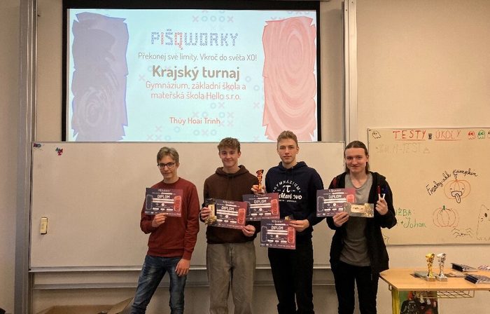 Největší soutěž pro žáky základních a středních škol Česka a Slovenska ve hře piškvorky zná své finalisty za MS kraj. A nás moc těší, že tentokrát mezi nimi nechybí zástupci naší školy, konkrétně tým Π-škvorky ve složení Petr Němec, Ondřej Havlásek, Filip Jarolím, Vojtěch Ptáčník, Martin Melecký (všichni 7. B), který v pondělí 25. 11. po lítém boji na krajském turnaji na Gymnáziu a Základní škole Hello dosáhl postupového 3. místa.