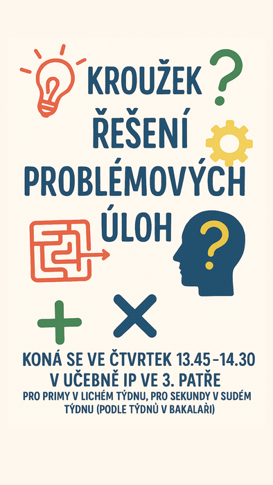 Pro studenty nižšího gymnázia z prim a sekund jsme i ve školním roce 2025/2026 připravili matematický kroužek. Garantovat jej bude RNDr. Radek Krpec, Ph.D. z Pedagogické fakulty Ostravské Univerzity. Kroužek se bude konat vždy ve čtvrtek od 13:45 h do 14:30 h a to tak, že v lichém týdnu (podle systému Bakaláři) bude kroužek pro žáky z prim a v sudém týdnu pro žáky ze sekund. Zahájení práce v kroužku je 11. 9. 2025 v učebně UIP („oranžová“ učebna, 3. patro) a začínají žáci ze sekund (sudý týden). Žáci z prim začínají 18. 9. (lichý týden).