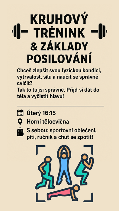 Chceš zlepšit svou kondici, získat sílu a naučit se správně cvičit? Přijď na kruhový trénink, který je zaměřený na rozvoj vytrvalosti, síly i koordinace. Čekají tě různorodá