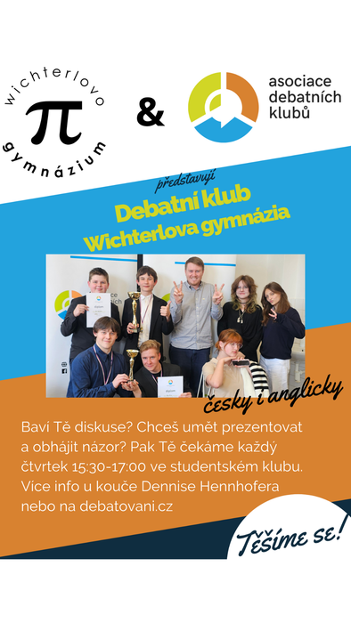 Baví tě diskutovat? Chceš se naučit lépe vyhodnocovat informace? Máš trému při prezentaci a chceš se jí zbavit? Láká Tě naučit se porazit všechny kvalitními argumenty? Pak debatní klub je právě pro tebe! Klub je otevřen všem WiGymáků i kamarádům z jiných škol. Naučíš se pravidla debatování podle Karla Poppera nebo WSDC a mladší v rámci Debatiády. Budeš mít možnost utkat se s týmy po celé ČR, online i v zahraničí. Proto debatujeme také anglicky. Přihlášku a další informace podá kouč Dennis Hennhofer.
