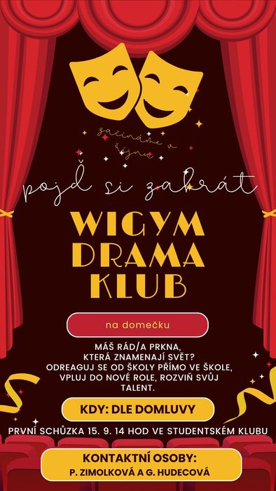 Klub je skupina divadelních nadšenců, která má ráda divadlo, nebojí se mluvit, hrát a improvizovat před publikem, společně nacvičuje divadelní představení. Společně budeme objevovat svět divadla, zkoušet různé herecké techniky, pracovat na vlastních scénářích a připravovat představení pro školní akce. Klub povedou Pavla Zimolková a Gabriela Hudecová.