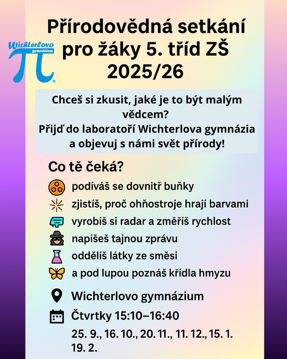 Předpokládané termíny: 25. září, 16. října, 20. listopadu, 11. prosince, 15. ledna a 19.února. Setkávali bychom se v budově Wichterlova gymnázia ve čtvrtek od 15:10 do cca 16:40.