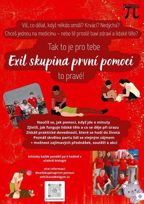 Kroužek je určen studentům, kteří se zajímají o první pomoc, zdravovědu a příbuzná témata. V tomto kroužku pracuje pod vedení Mgr. Ireny Šefčíkové studentů vyššího i nižšího gymnázia, kteří se scházejí každý týden v budově školy. Mezi naše pravidelně organizované akce patří např. den „První pomoc na Exilu“, kde se zásadami poskytování první pomoci seznamujeme své spolužáky, ale také žáky partnerských ZŠ – každoročně se zapojujeme do celorepublikových sbírek: např.: Světluška, Světový den boje proti AIDS nebo Den boje proti rakovině. Úzce spolupracujeme s profesionály (např. s Červeným křížem Ostrava) a navštěvujeme integrovaný systém PP. Můžete se s námi setkat na akci Škola na Hlavní třídě nebo na Dnu otevřených dveří. Mnoho z nás nadšených pokračuje ve studiu zdravotnických oborů: všeobecné lékařství, záchranářství a fyzioterapie na lékařských a zdravotně-sociálních fakultách v ČR. Další info a přihlášky u Mgr. Ireny Šefčíkové.