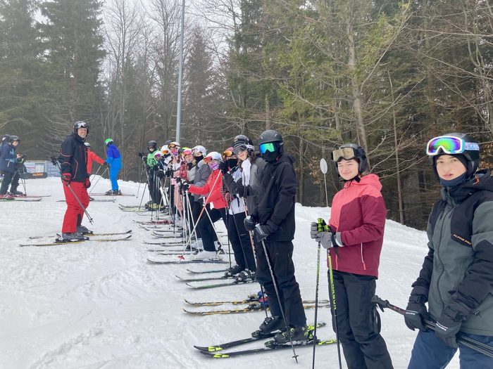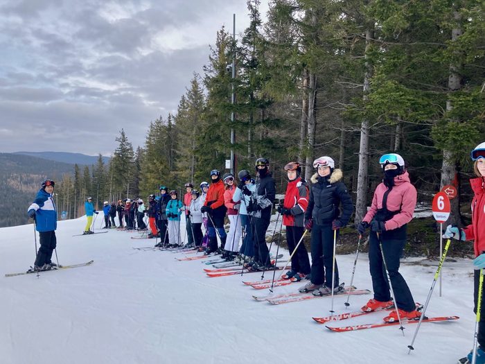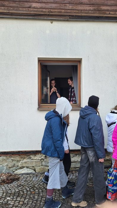 Tak tedy – 24. února 2025 vyrazila výprava složená ze studentů 1.C a 1.D, profesorek Hudecové, Melichárkové a Olivkové, profesorů Dybala, Krchňáka a mé maličkosti směrem na Karlov pod Pradědem, kterým nabízel kopec, sníh, lanovku i teplou stravu. Na místě se všichni rozdělili do 4 výkonnostních družstev, zamávali na sluníčko (které první večer zašlo a pak už ho až do posledního dne pobytu nikdo nespatřil), hodili si věci na pokoj, vrazili klíčníkovi klíče a vyrazili na svah. Jak vám jenom ze své pozice gaučového povaleče přiblížit ten adrenalinový zážitek, pocit svobody a dobrodružství, který zažívá každý člověk, který kdy zůstal v penzionu sám? Nu, když zrovna nevymýšlíte večerní program, neplníte úlohu klíčníka nebo nepíšete článek, lidé vás nepříjemně často budí. Například ve chvíli, kdy se vrátí ze svahu a chtějí, abyste jim poskytli předtím pečlivě vybrané klíče od pokojů. Mimochodem, po tomto zcela ojedinělém incidentu jsem byl již druhý den výpravy uznán jako jedinec, který je pro funkci klíčníka asi stejně vhodný jako epileptik na obsluhu stroboskopu a mou úlohu příkladným způsobem převzal příhodně zraněný student Matěj
