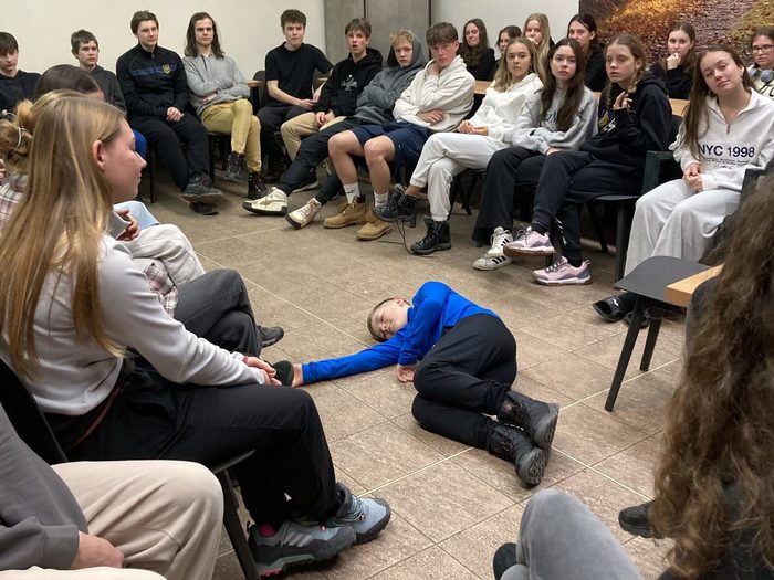 Večer nás čekala přednáška dlouholetého zdravotníka wigymských lyžáků MUDr. Petra Jašša. Ten neváhal a položil svého syna coby Izáka na pomyslný oltář vědy, kde na něm demonstroval správný způsob otevírání čelistí osoby bezvědomé, techniku kontroly zapadlého jazyka atd. Dozvěděli jsme se také, proč se mohou ztepilí čtyřicátníci při návštěvě posilovny zhroutit stejně snadno jako plány na třídenní speciální operaci a mnoho dalšího. Nikdo z nás se již myslím nebude dívat na energy drinky stejnýma očima.