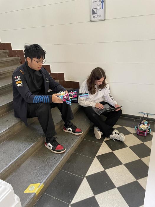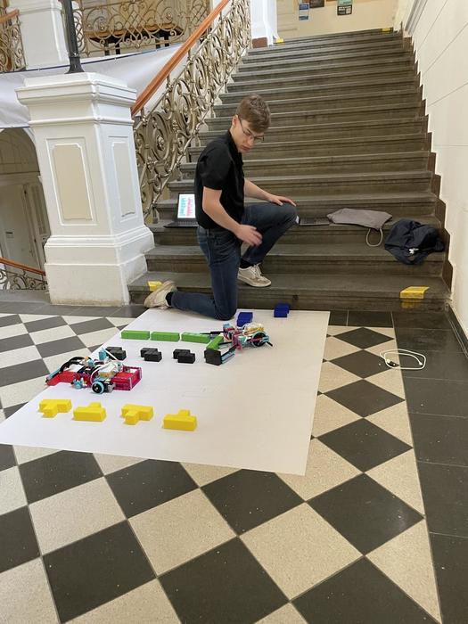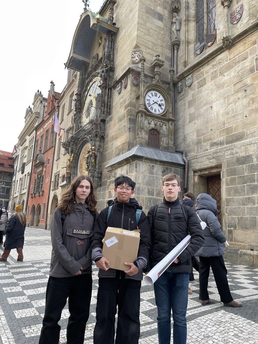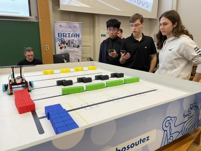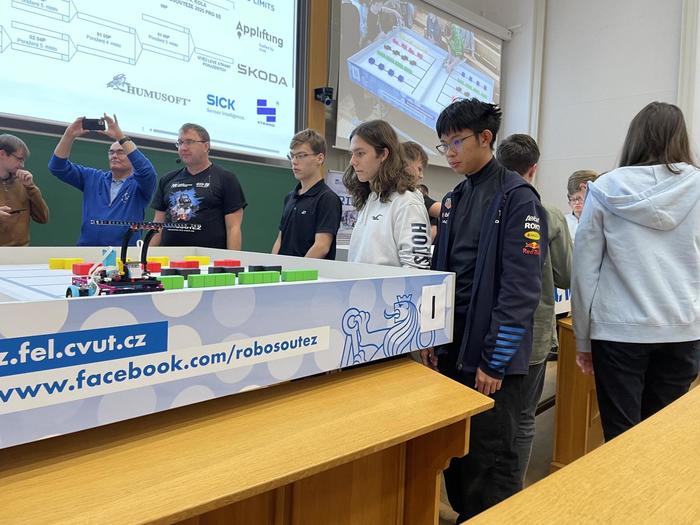 Naši studenti (Tobiáš Hrivňák, Filip Kubík a Dat Nguyen ze 6. B) na projektu pracovali týdny. Stavěli, testovali, ladili a znovu začínali od nuly, když se robot nechoval tak, jak měl. V pátek 21. listopadu nakonec předvedli svého robota v Zengerově posluchárně na Karlově náměstí v Praze.