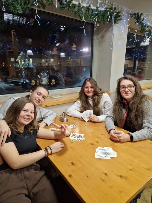 Večery si žáci zpříjemnili společenskými hrami, které přispěly k upevnění přátelských vztahů a vytvořily příjemnou atmosféru. Hry, smích a zábava byly skvělým zakončením každého dne stráveného na svazích.