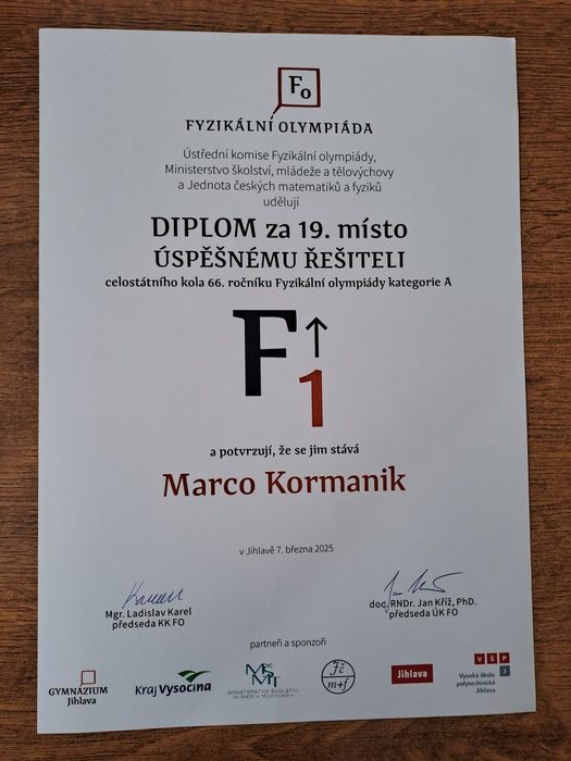 V Jihlavě se konalo Ústřední kolo fyzikální olympiády kategorie A, na které byli za své výborné výsledky v krajském kole pozváni Marco Kormanik (7. B) a Jakub Mršťák (8.B). Ze čtyřiceti účastníků bylo vyhlášeno 30 úspěšných řešitelů a na pěkném 19. místě se umístil Marco Kormanik.