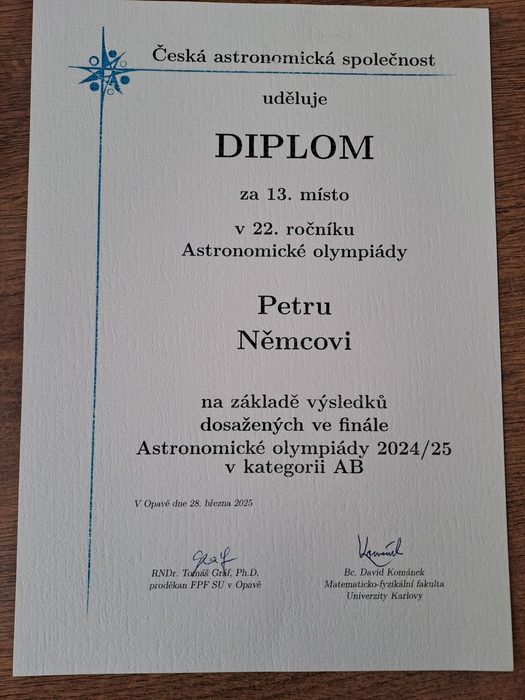 Ústřední kolo Astronomické olympiády kategorie AB proběhlo v Opavě, a tak to Petr Němec ze 7. B (2. místo v krajském kole) neměl daleko. Petr vybojoval krásné 13. místo.